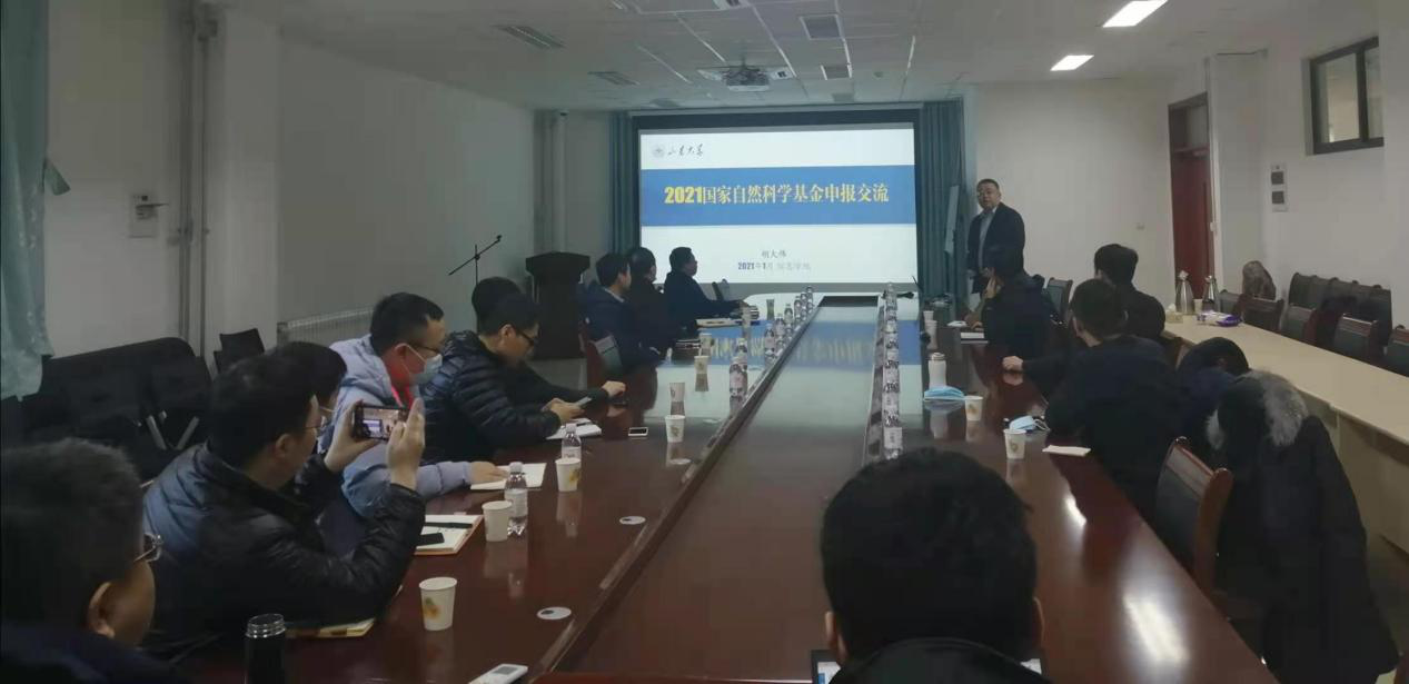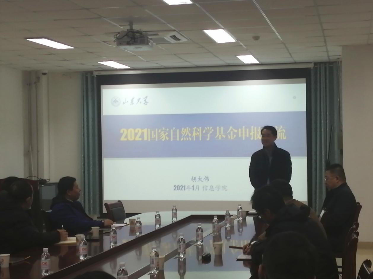 会上,胡大伟总结分析了我校2020年度基金申报立项情况,介绍讲解了2021年的国家政策和形势。结合我院2020年的申报数据,对2021年的工作开展和申报策略等方面提出了建议。报告结束后,学院教师就申报工作中遇到的具体问题与科研院同志们进行了深入探讨。